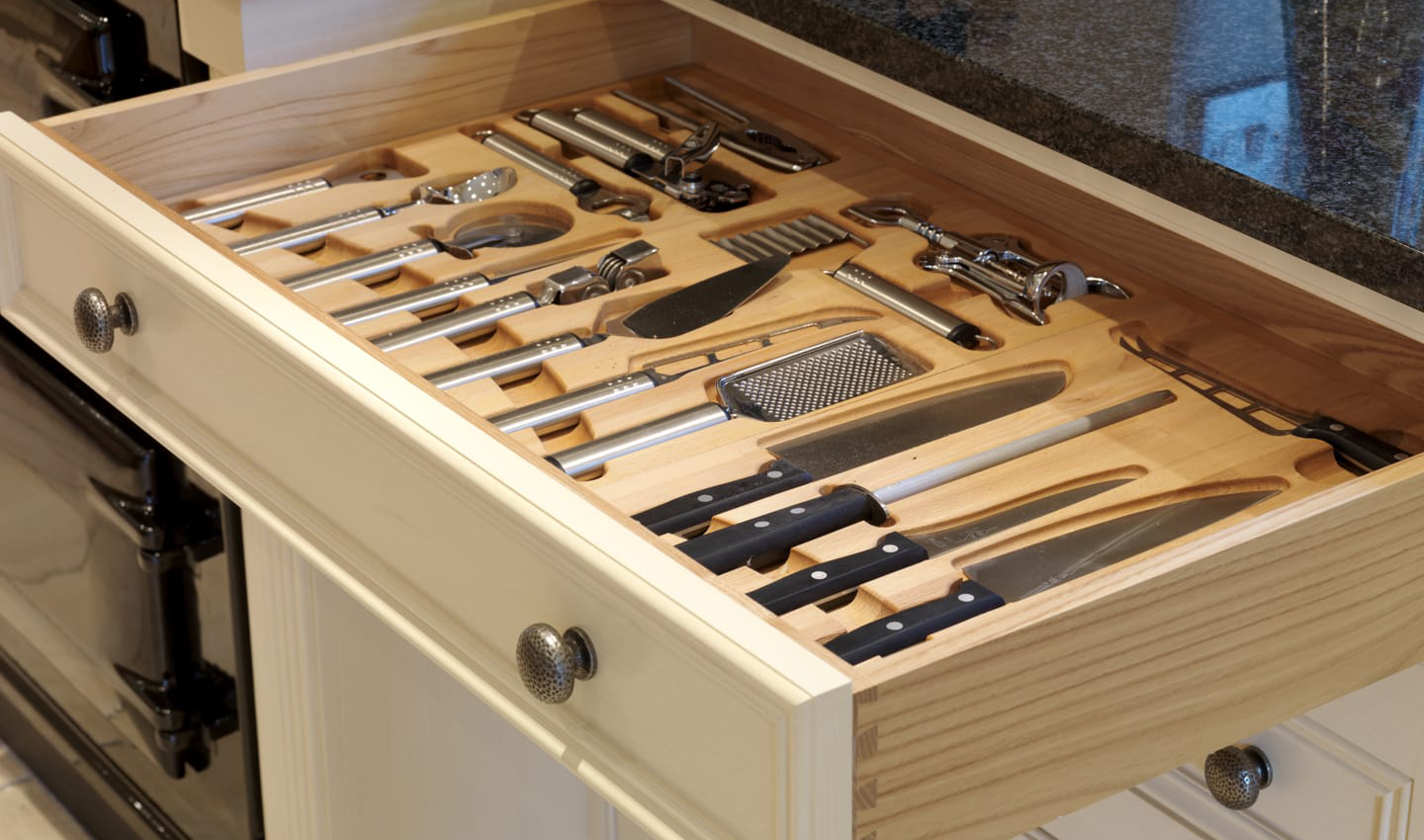 The basin is set into a marble work surface, while Crema Marfil marble is used for the floor. A large cupboard with double doors is at the base with a false drawer above it that ensures the basin is completely concealed when the doors are opened.